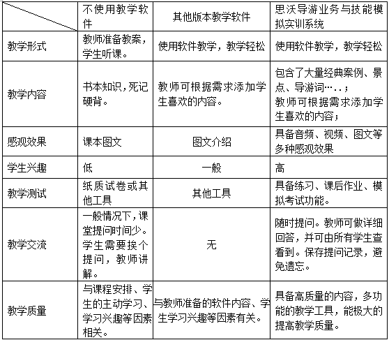 在(zai)本教學軟件(jian)中(zhong),囊括(kuo)了幾乎所(suo)有(you)(you)導游(you)所(suo)需(xu)要的各(ge)種(zhong)(zhong)信(xin)息,這種(zhong)(zhong)信(xin)息量可(ke)以說是(shi)海納百川,是(shi)一個龐大(da)的數據(ju)庫。學校使用(yong)這個數據(ju)庫不但可(ke)以提供為教師(shi)上課使用(yong),還(huan)可(ke)以成為學生(sheng)的電子閱覽書庫,例(li)如(ru)在(zai)“景(jing)(jing)點(dian)視頻”模塊中(zhong)有(you)(you)包(bao)含國(guo)內外大(da)量著名景(jing)(jing)點(dian)的視頻介紹(shao),生(sheng)動有(you)(you)趣。其中(zhong)許多(duo)內容(rong),包(bao)括(kuo)天文(wen)地(di)理、人文(wen)經濟、法律法規、禮儀儀態等,將不單(dan)單(dan)滿(man)足旅(lv)游(you)專業的學生(sheng),還(huan)可(ke)以提供給非旅(lv)游(you)專業的學生(sheng)大(da)量、豐富的文(wen)化知(zhi)識。