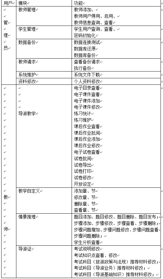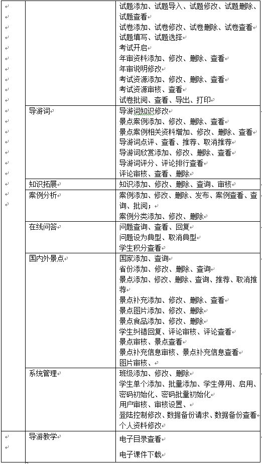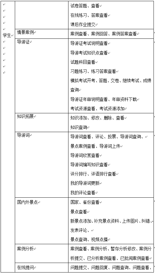學(xue)(xue)生的(de)(de)(de)主要功能(neng)是導(dao)(dao)游教學(xue)(xue)知識的(de)(de)(de)學(xue)(xue)習(xi)、完成情景推理中包含的(de)(de)(de)案(an)例及題目、導(dao)(dao)游證考(kao)(kao)試學(xue)(xue)習(xi)及模擬(ni)考(kao)(kao)試、導(dao)(dao)游拓展知識學(xue)(xue)習(xi),同時可添加新的(de)(de)(de)知識供其(qi)他同學(xue)(xue)學(xue)(xue)習(xi)、導(dao)(dao)游詞學(xue)(xue)習(xi)并編寫導(dao)(dao)游詞、國內外景點(dian)學(xue)(xue)習(xi)、案(an)例分析和在線提(ti)問(wen)。