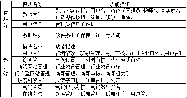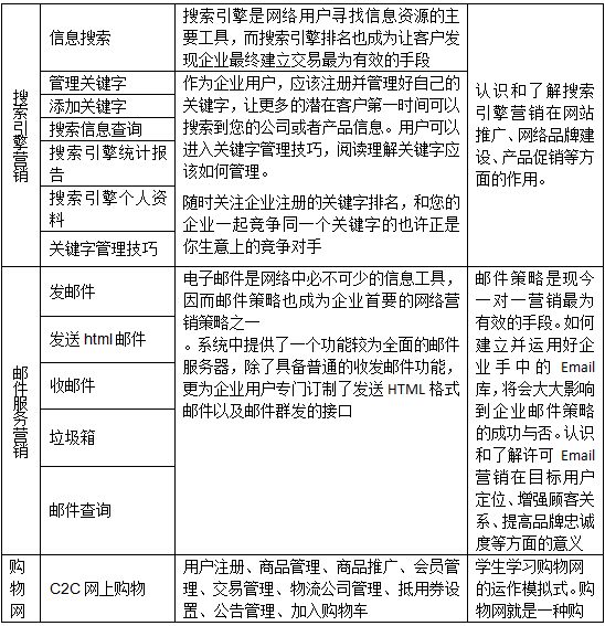 1、軟件用戶從初次訪問企(qi)業網站到跟該企(qi)業訂購產品的(de)整個(ge)過程,可將(jiang)其分(fen)成三個(ge)階段(duan):網站建設階段(duan)、營銷(xiao)(xiao)(xiao)推廣階段(duan)和在線業務(wu)管理階段(duan)。模塊中應包括:網站建設、搜(sou)索(suo)引擎營銷(xiao)(xiao)(xiao)、郵件推廣、網絡溝通、信息搜(sou)索(suo)與發布、搜(sou)索(suo)引擎優化、網絡廣告制作(zuo)(zuo)、、客戶服務(wu)、在線銷(xiao)(xiao)(xiao)售等技能的(de)專(zhuan)項實(shi)訓(xun),也能將(jiang)專(zhuan)項實(shi)訓(xun)匯總(zong),方便學生開展企(qi)業網站綜合營銷(xiao)(xiao)(xiao)、作(zuo)(zuo)出網絡營銷(xiao)(xiao)(xiao)效果評估(gu)等的(de)集中實(shi)訓(xun)。